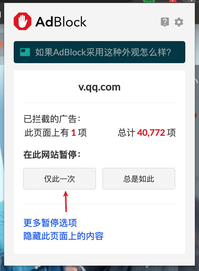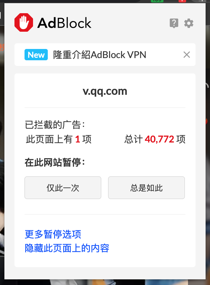如果某些网站检测到正在使用广告拦截插件,而不给我们显示主要内容时,我们可以通过暂停按钮,暂停广告的拦截,如下图: